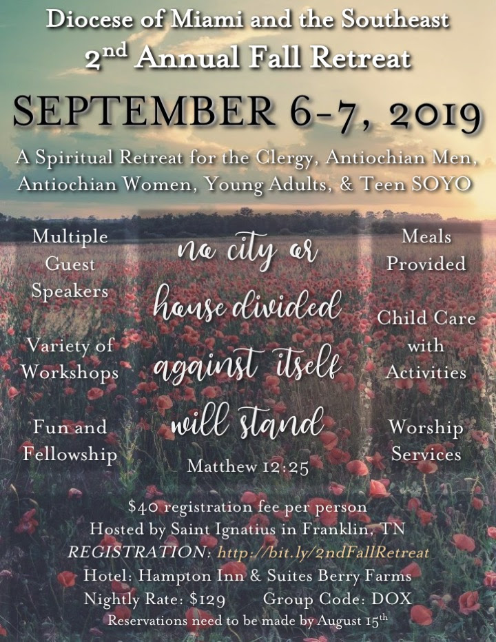 A Spiritual Retreat for the Clergy, Antiochian Men, Women, Young Adults, & Teen SOYO. Hosted by St.Ignatius Church in Franklin, TN: September 6-7, 2019.