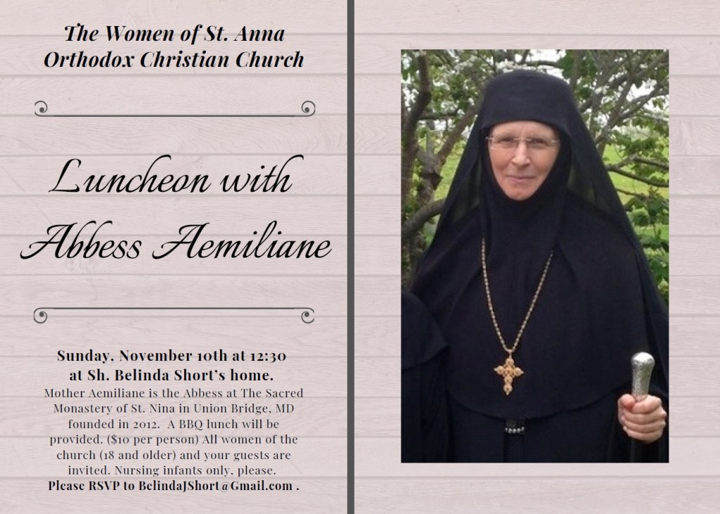Sunday, November 10th at 12:30 at Sh. Belinda Short’s home). Mother Aemiliane is the Abbess at the Sacred Monastery of St. Nina in Union Bridge, MD founded in 2012. A BBQ lunch will be provided. ($10 per person) All women of the church (18 and older) and your guests are invited. Nursing infants only, please. Please RSVP to BelindaJShort@Gmail.com.